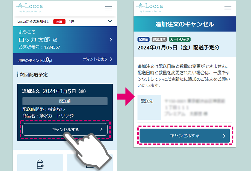 浄水カートリッジの追加注文は、マイページTOP画面の「次回配送予定」からキャンセルできます。