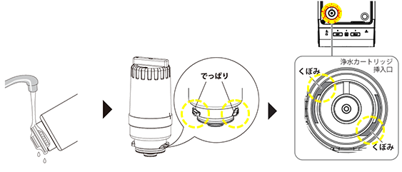 あらかじめ浄水カートリッジの下部を水道水で濡らし、2か所のでっぱりを挿入口の2か所のくぼみに合わせ入れます。