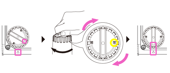 製品正面から見てつまみが縦方向になるまでしっかり回してください。