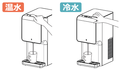 温水 ロック解除ボタンを約3秒長押しし、上のランプが点灯したら【HOT】ボタンを押し続けて出水確認をします。