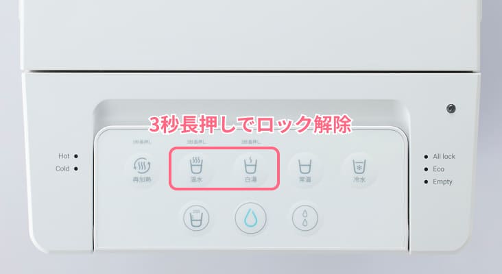 温水、白湯を出水する際は、温度帯のボタンを長押しすることでチャイルドロックが解除される仕様です。