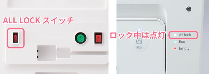 背面にあるALL LOCKスイッチをONにすると、操作パネルのボタン全てをロックすることができます。